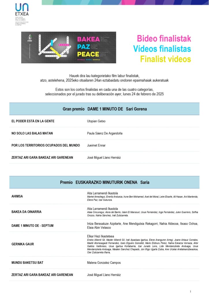 25 February, 2025Hauek dira epaimahaiak aukeratu dituen film labur finalistak, atzo 2025eko otsailaren 24an eztabaidatu ondoren: